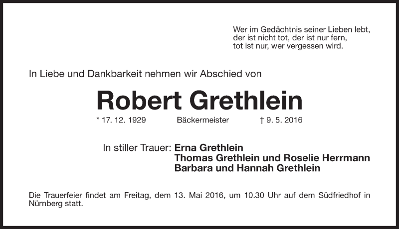 Hier finden Sie alle Traueranzeigen aus der Zeitung, die bisher für Robert Grethlein erschienen sind. Weitere Traueranzeigen, die in der Zeitung erscheinen, werden hier ebenfalls aufgelistet