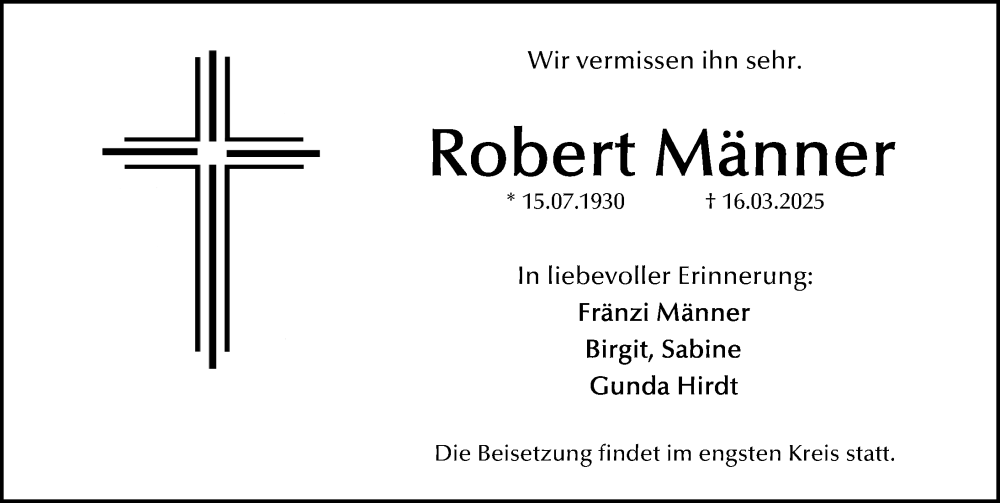 Hier finden Sie alle Traueranzeigen aus der Zeitung, die bisher für Robert Männer erschienen sind. Weitere Traueranzeigen, die in der Zeitung erscheinen, werden hier ebenfalls aufgelistet