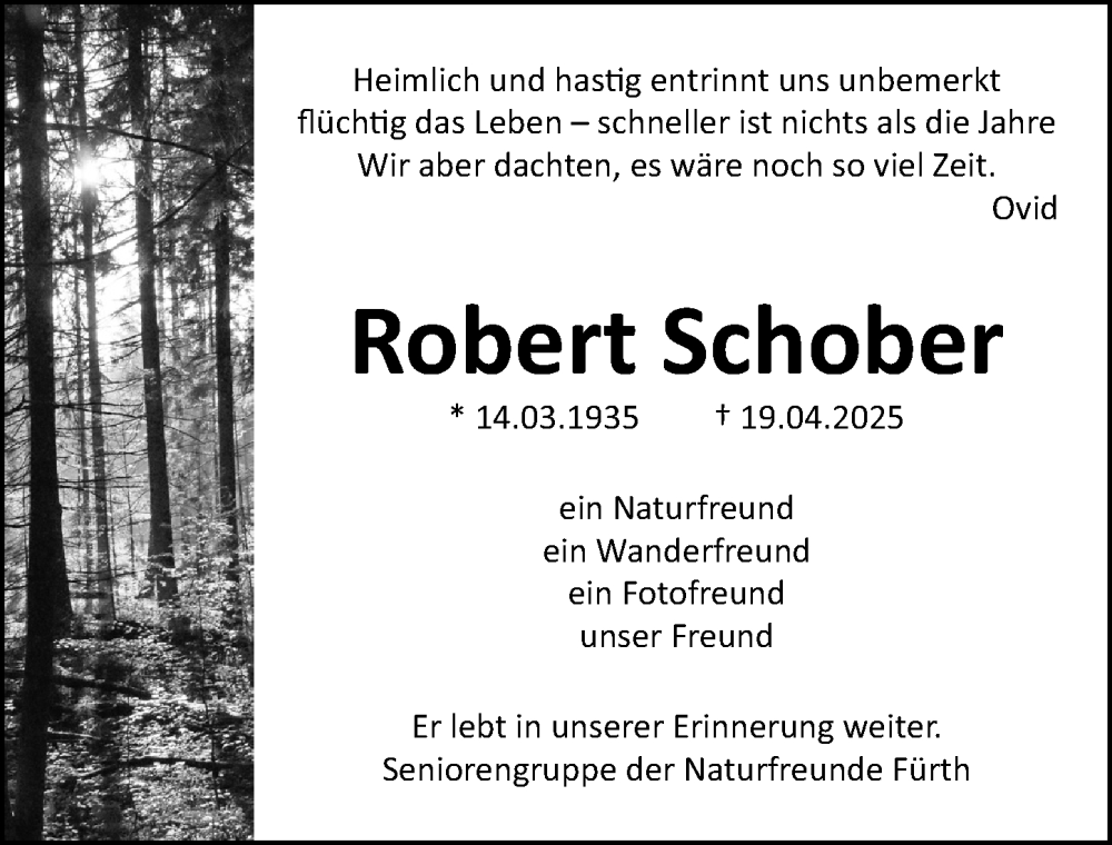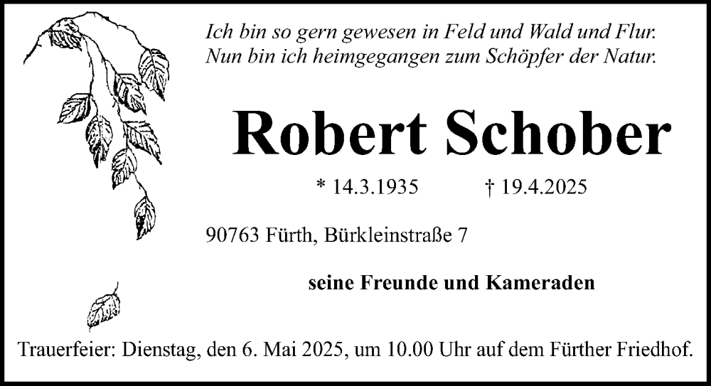Hier finden Sie alle Traueranzeigen aus der Zeitung, die bisher für Robert Schober erschienen sind. Weitere Traueranzeigen, die in der Zeitung erscheinen, werden hier ebenfalls aufgelistet