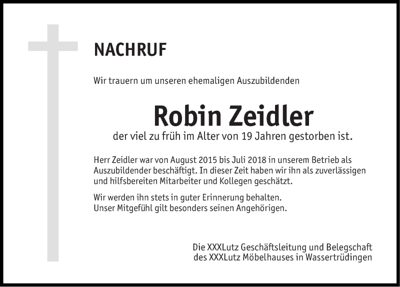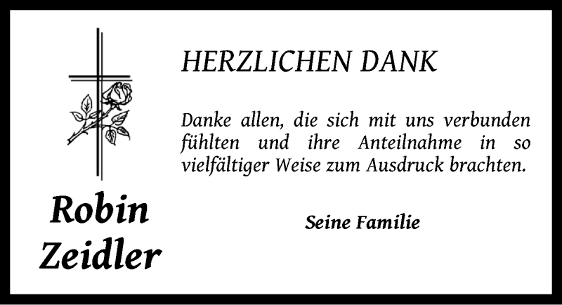 Hier finden Sie alle Traueranzeigen aus der Zeitung, die bisher für Robin Zeidler erschienen sind. Weitere Traueranzeigen, die in der Zeitung erscheinen, werden hier ebenfalls aufgelistet