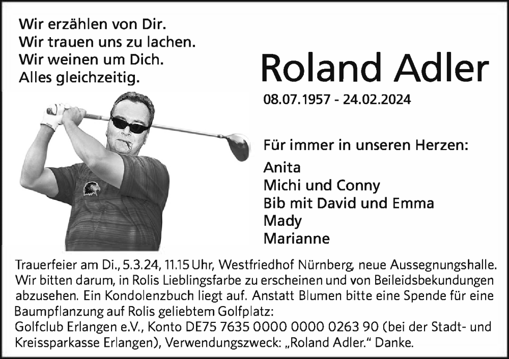 Hier finden Sie alle Traueranzeigen aus der Zeitung, die bisher für Roland Adler erschienen sind. Weitere Traueranzeigen, die in der Zeitung erscheinen, werden hier ebenfalls aufgelistet