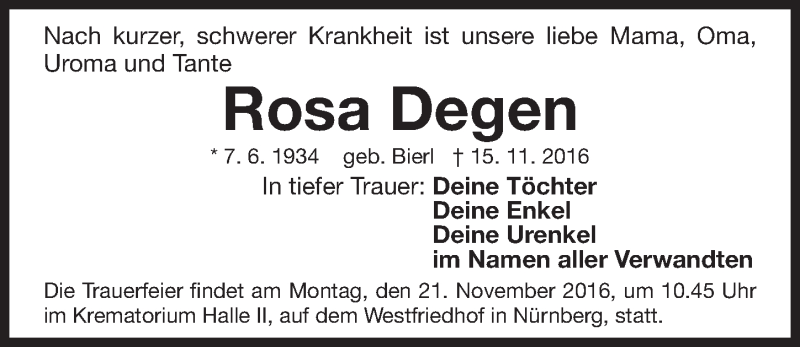 Hier finden Sie alle Traueranzeigen aus der Zeitung, die bisher für Rosa Degen erschienen sind. Weitere Traueranzeigen, die in der Zeitung erscheinen, werden hier ebenfalls aufgelistet