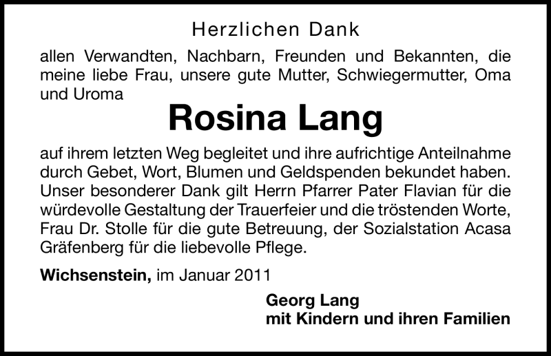 Hier finden Sie alle Traueranzeigen aus der Zeitung, die bisher für Rosina Lang erschienen sind. Weitere Traueranzeigen, die in der Zeitung erscheinen, werden hier ebenfalls aufgelistet