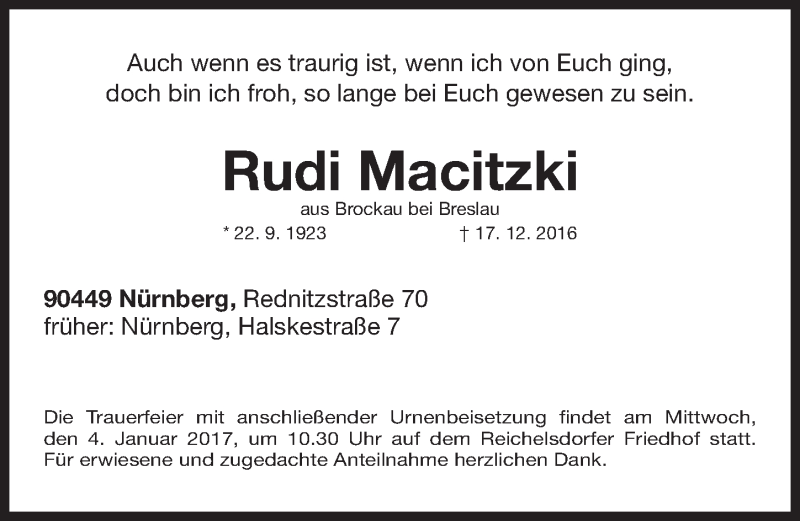Hier finden Sie alle Traueranzeigen aus der Zeitung, die bisher für Rudi Macitzki erschienen sind. Weitere Traueranzeigen, die in der Zeitung erscheinen, werden hier ebenfalls aufgelistet