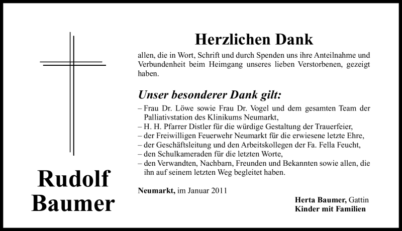 Hier finden Sie alle Traueranzeigen aus der Zeitung, die bisher für Rudolf Baumer erschienen sind. Weitere Traueranzeigen, die in der Zeitung erscheinen, werden hier ebenfalls aufgelistet