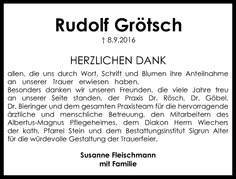 Hier finden Sie alle Traueranzeigen aus der Zeitung, die bisher für Rudolf Grötsch erschienen sind. Weitere Traueranzeigen, die in der Zeitung erscheinen, werden hier ebenfalls aufgelistet