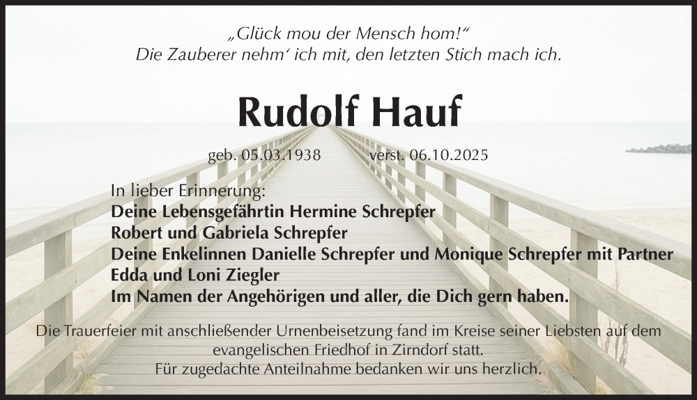 Hier finden Sie alle Traueranzeigen aus der Zeitung, die bisher für Rudolf Hauf erschienen sind. Weitere Traueranzeigen, die in der Zeitung erscheinen, werden hier ebenfalls aufgelistet