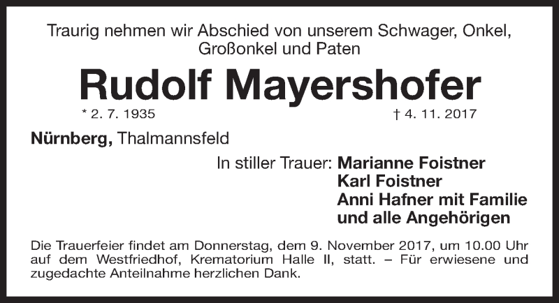 Hier finden Sie alle Traueranzeigen aus der Zeitung, die bisher für Rudolf Mayershofer erschienen sind. Weitere Traueranzeigen, die in der Zeitung erscheinen, werden hier ebenfalls aufgelistet