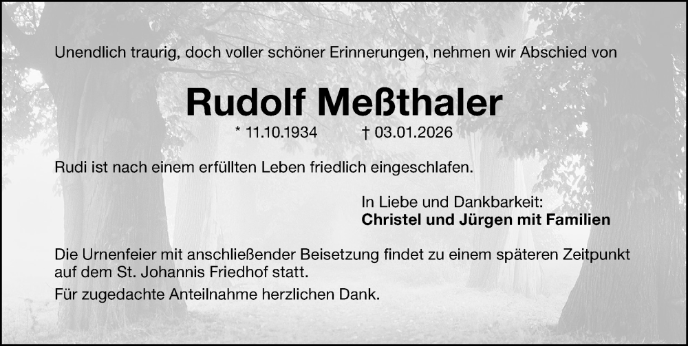 Hier finden Sie alle Traueranzeigen aus der Zeitung, die bisher für Rudolf Meßthaler erschienen sind. Weitere Traueranzeigen, die in der Zeitung erscheinen, werden hier ebenfalls aufgelistet