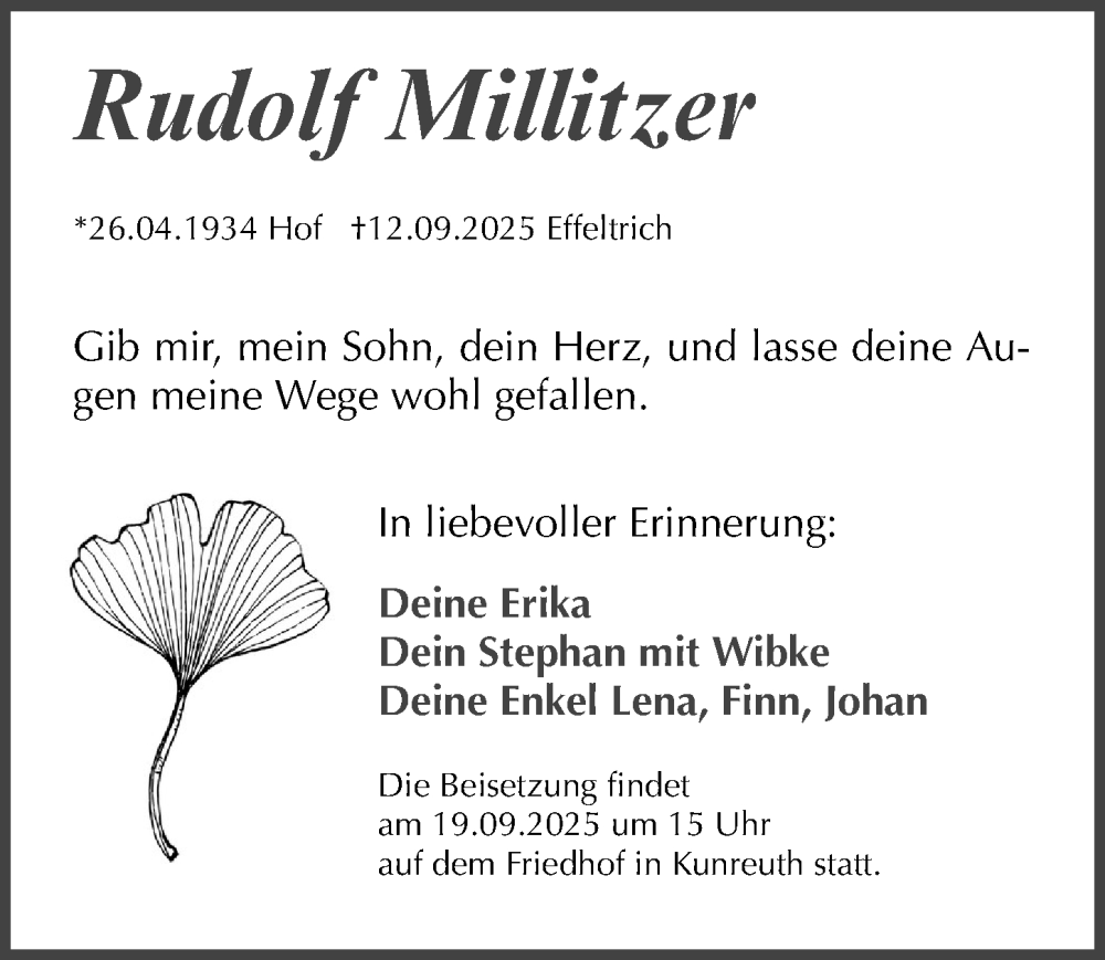 Hier finden Sie alle Traueranzeigen aus der Zeitung, die bisher für Rudolf Millitzer erschienen sind. Weitere Traueranzeigen, die in der Zeitung erscheinen, werden hier ebenfalls aufgelistet