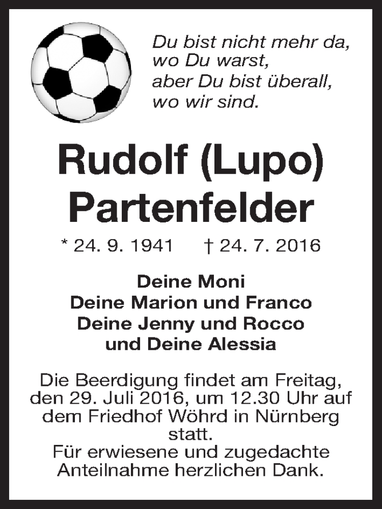 Hier finden Sie alle Traueranzeigen aus der Zeitung, die bisher für Rudolf Partenfelder erschienen sind. Weitere Traueranzeigen, die in der Zeitung erscheinen, werden hier ebenfalls aufgelistet