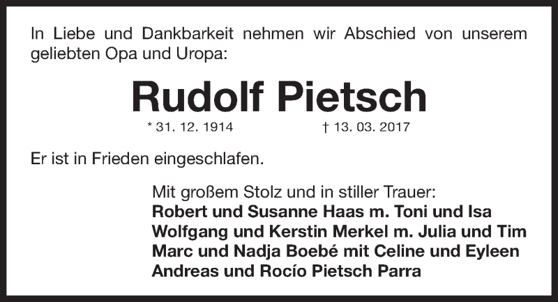 Hier finden Sie alle Traueranzeigen aus der Zeitung, die bisher für Rudolf Pietsch erschienen sind. Weitere Traueranzeigen, die in der Zeitung erscheinen, werden hier ebenfalls aufgelistet