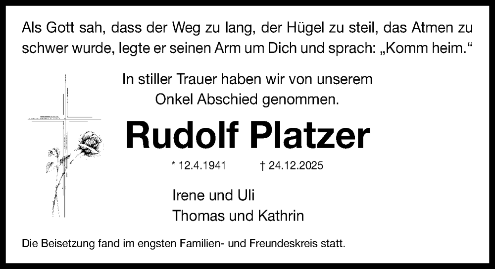 Hier finden Sie alle Traueranzeigen aus der Zeitung, die bisher für Rudolf Platzer erschienen sind. Weitere Traueranzeigen, die in der Zeitung erscheinen, werden hier ebenfalls aufgelistet