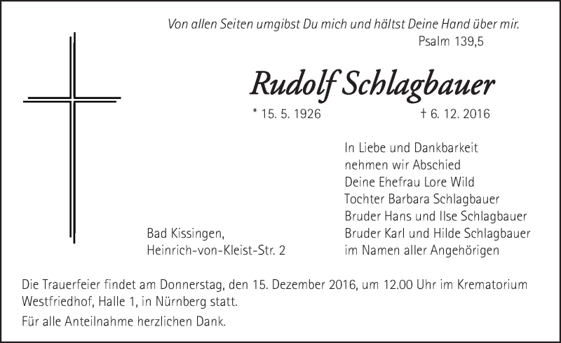 Hier finden Sie alle Traueranzeigen aus der Zeitung, die bisher für Rudolf Schlagbauer erschienen sind. Weitere Traueranzeigen, die in der Zeitung erscheinen, werden hier ebenfalls aufgelistet