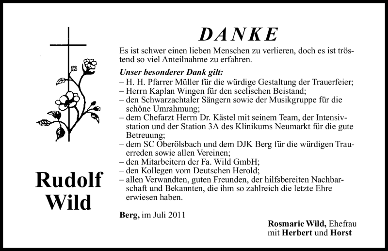 Hier finden Sie alle Traueranzeigen aus der Zeitung, die bisher für Rudolf Wild erschienen sind. Weitere Traueranzeigen, die in der Zeitung erscheinen, werden hier ebenfalls aufgelistet