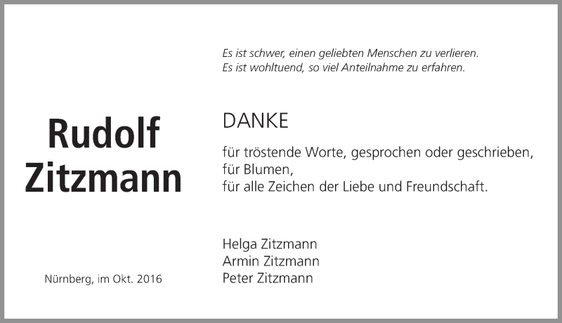 Hier finden Sie alle Traueranzeigen aus der Zeitung, die bisher für Rudolf Johann Zitzmann erschienen sind. Weitere Traueranzeigen, die in der Zeitung erscheinen, werden hier ebenfalls aufgelistet