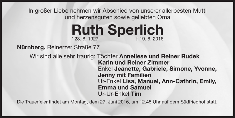 Hier finden Sie alle Traueranzeigen aus der Zeitung, die bisher für Ruth Sperlich erschienen sind. Weitere Traueranzeigen, die in der Zeitung erscheinen, werden hier ebenfalls aufgelistet