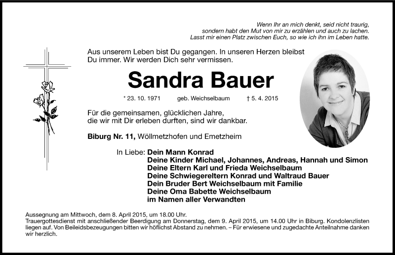 Hier finden Sie alle Traueranzeigen aus der Zeitung, die bisher für Sandra Bauer erschienen sind. Weitere Traueranzeigen, die in der Zeitung erscheinen, werden hier ebenfalls aufgelistet