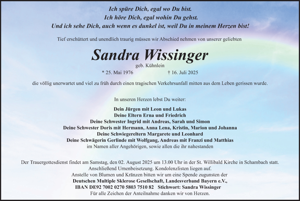 Hier finden Sie alle Traueranzeigen aus der Zeitung, die bisher für Sandra Wissinger erschienen sind. Weitere Traueranzeigen, die in der Zeitung erscheinen, werden hier ebenfalls aufgelistet