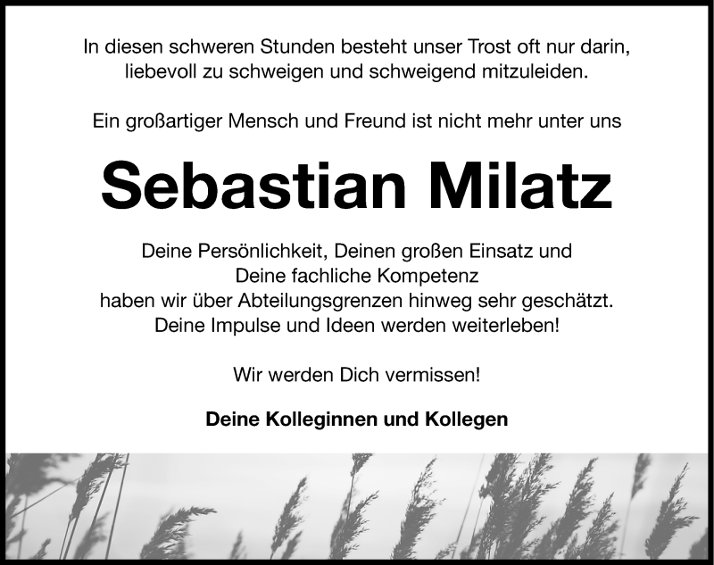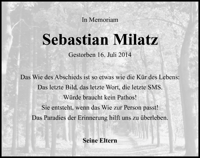 Hier finden Sie alle Traueranzeigen aus der Zeitung, die bisher für Sebastian Milatz erschienen sind. Weitere Traueranzeigen, die in der Zeitung erscheinen, werden hier ebenfalls aufgelistet