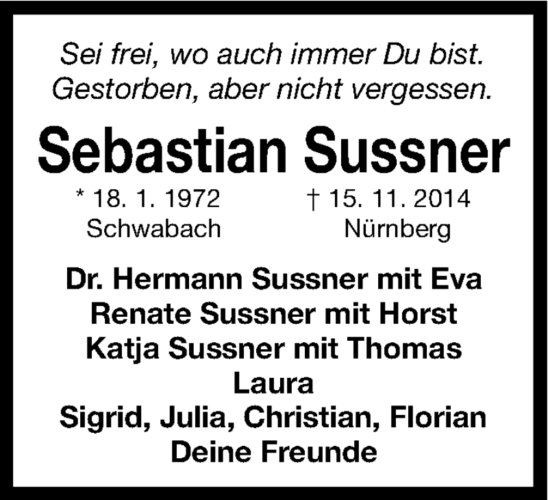 Hier finden Sie alle Traueranzeigen aus der Zeitung, die bisher für Sebastian Sussner erschienen sind. Weitere Traueranzeigen, die in der Zeitung erscheinen, werden hier ebenfalls aufgelistet