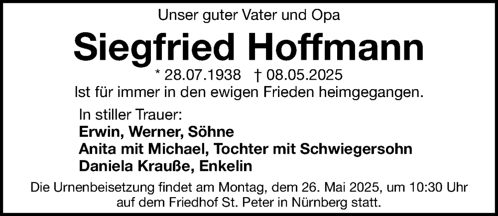 Hier finden Sie alle Traueranzeigen aus der Zeitung, die bisher für Siegfried Hoffmann erschienen sind. Weitere Traueranzeigen, die in der Zeitung erscheinen, werden hier ebenfalls aufgelistet