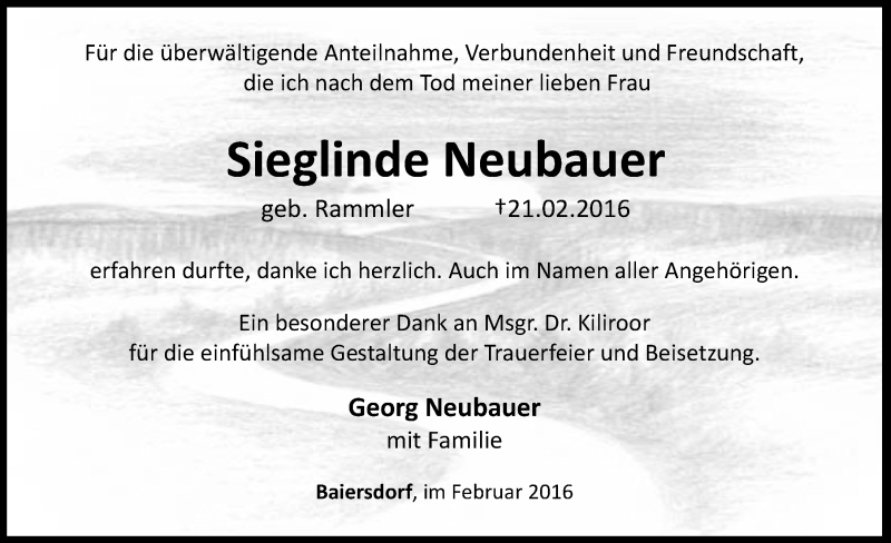 Hier finden Sie alle Traueranzeigen aus der Zeitung, die bisher für Sieglinde Neubauer erschienen sind. Weitere Traueranzeigen, die in der Zeitung erscheinen, werden hier ebenfalls aufgelistet
