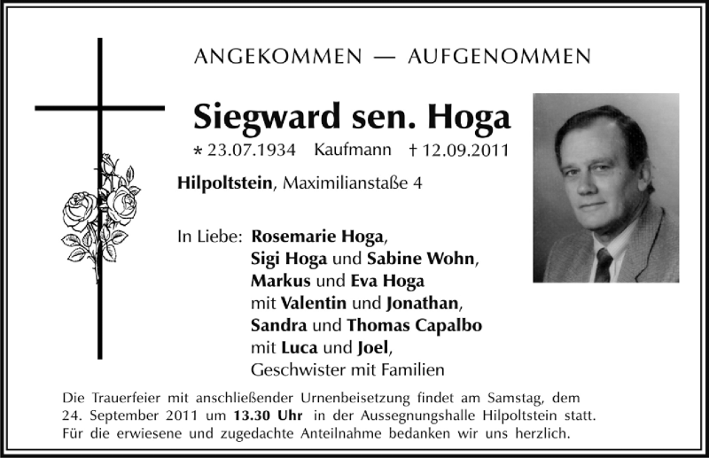Hier finden Sie alle Traueranzeigen aus der Zeitung, die bisher für Siegward Hoga erschienen sind. Weitere Traueranzeigen, die in der Zeitung erscheinen, werden hier ebenfalls aufgelistet