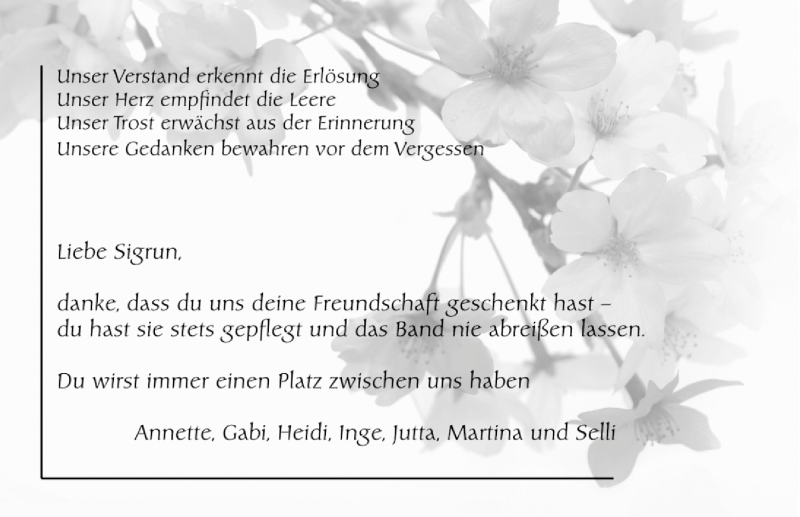 Hier finden Sie alle Traueranzeigen aus der Zeitung, die bisher für Sigrun erschienen sind. Weitere Traueranzeigen, die in der Zeitung erscheinen, werden hier ebenfalls aufgelistet