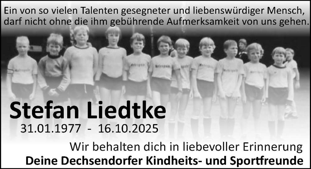 Hier finden Sie alle Traueranzeigen aus der Zeitung, die bisher für Stefan Liedtke erschienen sind. Weitere Traueranzeigen, die in der Zeitung erscheinen, werden hier ebenfalls aufgelistet