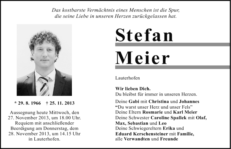 Hier finden Sie alle Traueranzeigen aus der Zeitung, die bisher für Stefan Meier erschienen sind. Weitere Traueranzeigen, die in der Zeitung erscheinen, werden hier ebenfalls aufgelistet