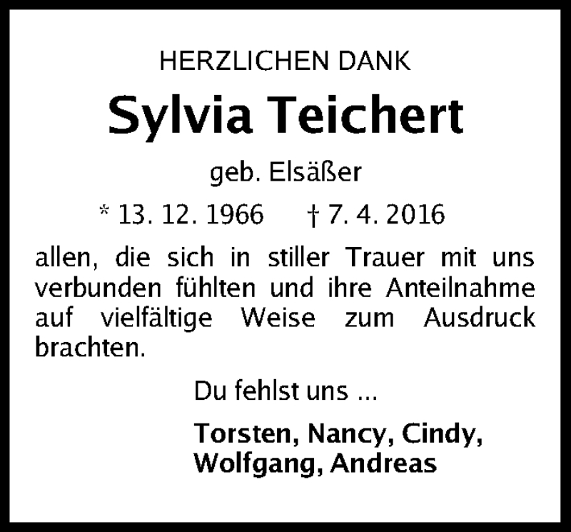 Hier finden Sie alle Traueranzeigen aus der Zeitung, die bisher für Sylvia Teichert erschienen sind. Weitere Traueranzeigen, die in der Zeitung erscheinen, werden hier ebenfalls aufgelistet