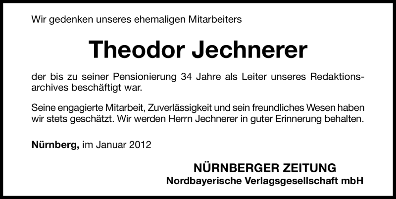 Hier finden Sie alle Traueranzeigen aus der Zeitung, die bisher für Theodor Jechnerer erschienen sind. Weitere Traueranzeigen, die in der Zeitung erscheinen, werden hier ebenfalls aufgelistet