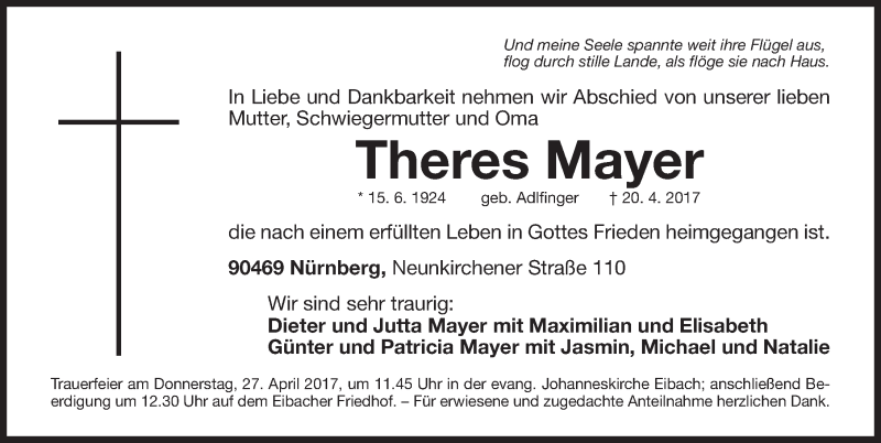 Hier finden Sie alle Traueranzeigen aus der Zeitung, die bisher für Theres Mayer erschienen sind. Weitere Traueranzeigen, die in der Zeitung erscheinen, werden hier ebenfalls aufgelistet