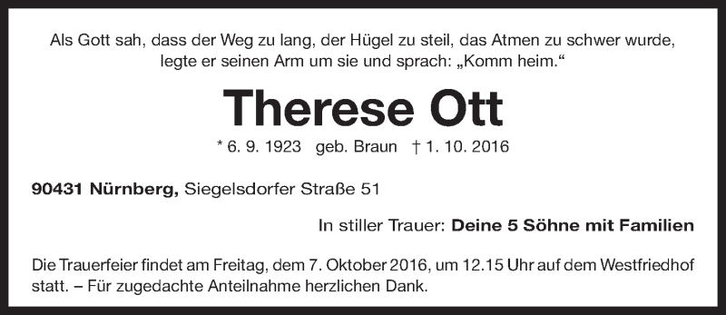 Hier finden Sie alle Traueranzeigen aus der Zeitung, die bisher für Therese Ott erschienen sind. Weitere Traueranzeigen, die in der Zeitung erscheinen, werden hier ebenfalls aufgelistet