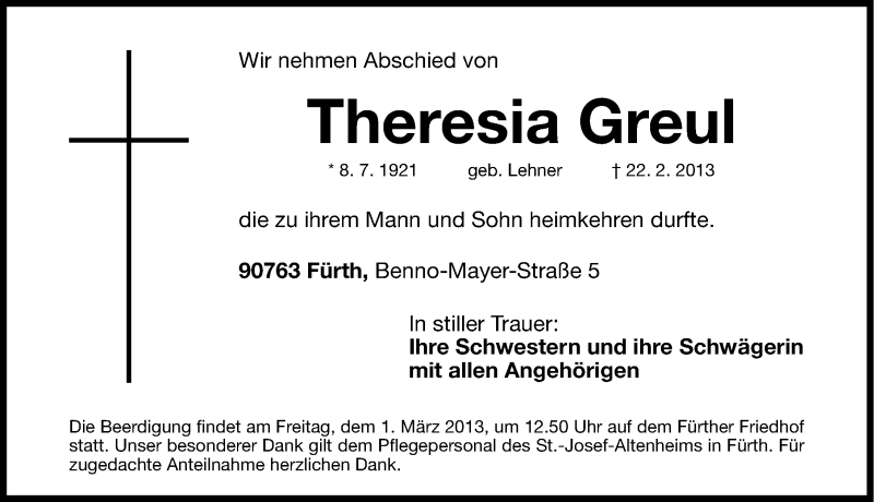 Hier finden Sie alle Traueranzeigen aus der Zeitung, die bisher für Theresia Greul erschienen sind. Weitere Traueranzeigen, die in der Zeitung erscheinen, werden hier ebenfalls aufgelistet
