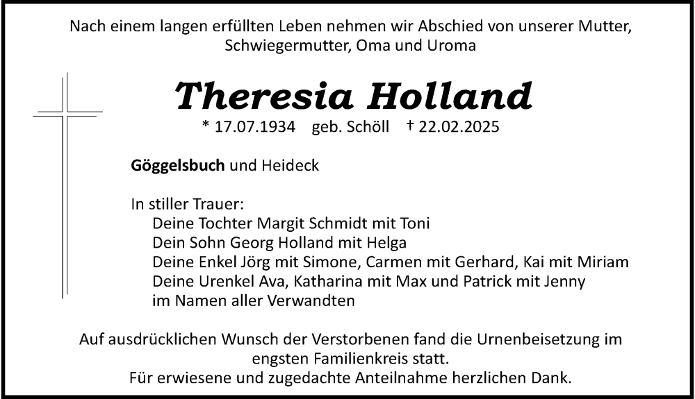 Hier finden Sie alle Traueranzeigen aus der Zeitung, die bisher für Theresia Holland erschienen sind. Weitere Traueranzeigen, die in der Zeitung erscheinen, werden hier ebenfalls aufgelistet
