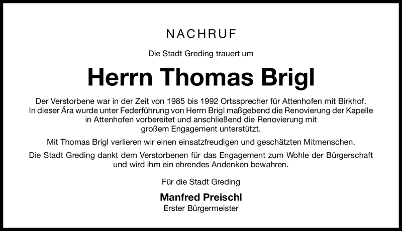 Hier finden Sie alle Traueranzeigen aus der Zeitung, die bisher für Thomas Brigl erschienen sind. Weitere Traueranzeigen, die in der Zeitung erscheinen, werden hier ebenfalls aufgelistet