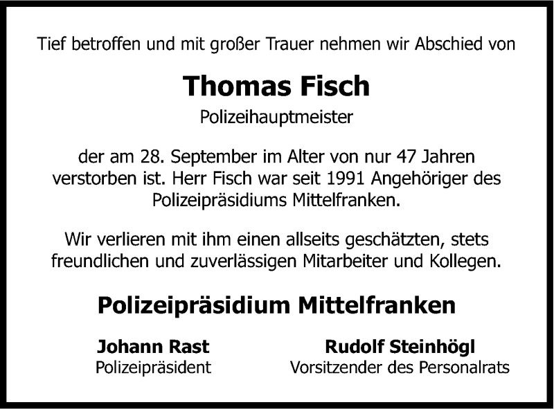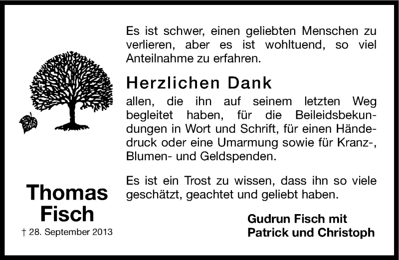 Hier finden Sie alle Traueranzeigen aus der Zeitung, die bisher für Thomas Fisch erschienen sind. Weitere Traueranzeigen, die in der Zeitung erscheinen, werden hier ebenfalls aufgelistet