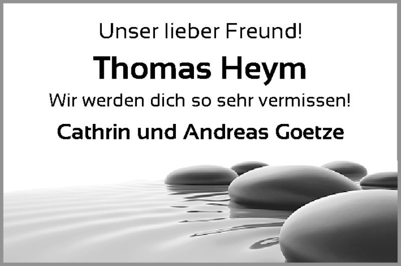 Hier finden Sie alle Traueranzeigen aus der Zeitung, die bisher für Thomas Heym erschienen sind. Weitere Traueranzeigen, die in der Zeitung erscheinen, werden hier ebenfalls aufgelistet
