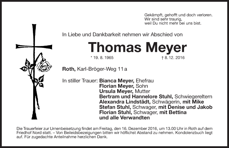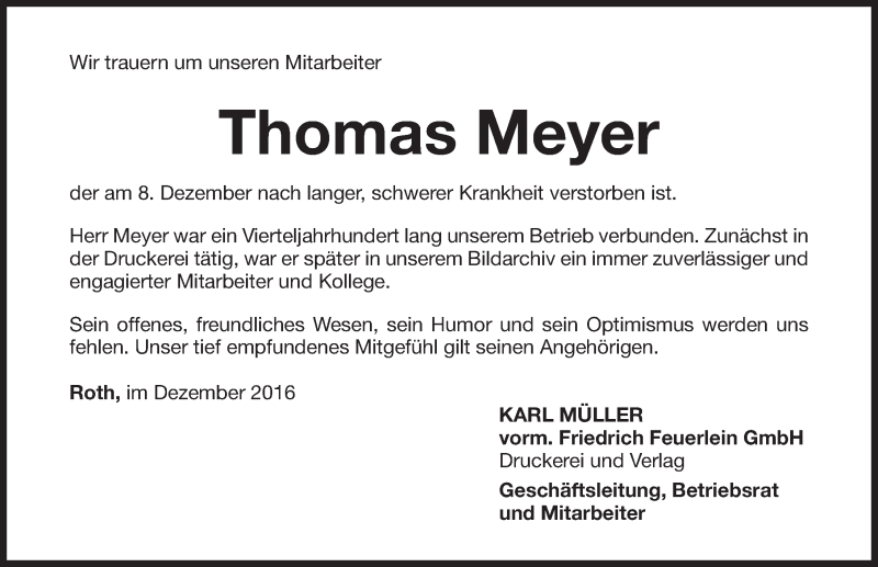 Hier finden Sie alle Traueranzeigen aus der Zeitung, die bisher für Thomas Meyer erschienen sind. Weitere Traueranzeigen, die in der Zeitung erscheinen, werden hier ebenfalls aufgelistet