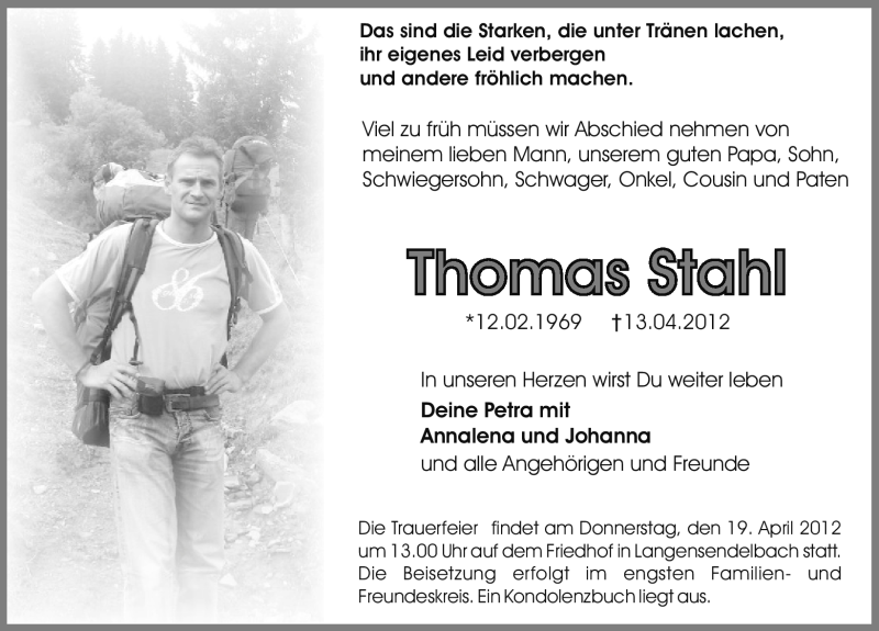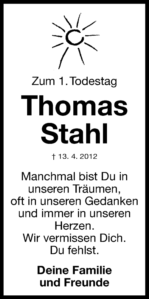 Hier finden Sie alle Traueranzeigen aus der Zeitung, die bisher für Thomas Stahl erschienen sind. Weitere Traueranzeigen, die in der Zeitung erscheinen, werden hier ebenfalls aufgelistet