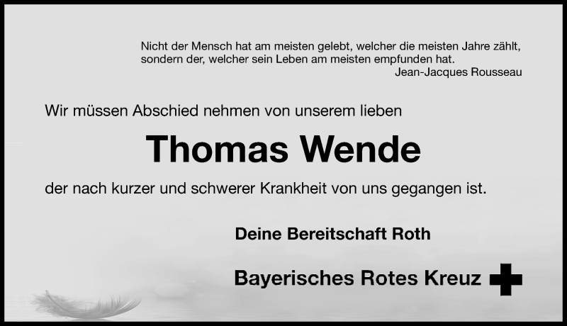 Hier finden Sie alle Traueranzeigen aus der Zeitung, die bisher für Thomas Wende erschienen sind. Weitere Traueranzeigen, die in der Zeitung erscheinen, werden hier ebenfalls aufgelistet
