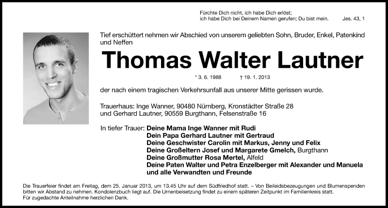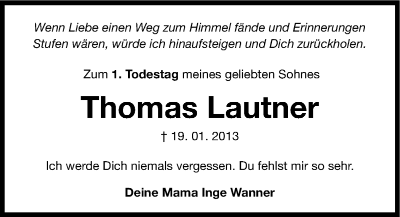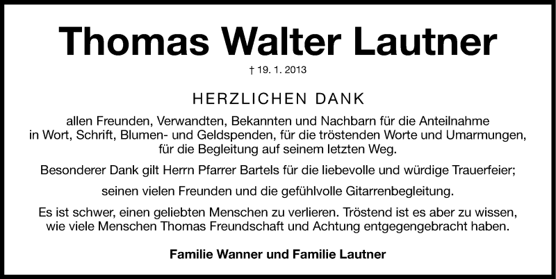 Hier finden Sie alle Traueranzeigen aus der Zeitung, die bisher für Thomas Walter Lautner erschienen sind. Weitere Traueranzeigen, die in der Zeitung erscheinen, werden hier ebenfalls aufgelistet