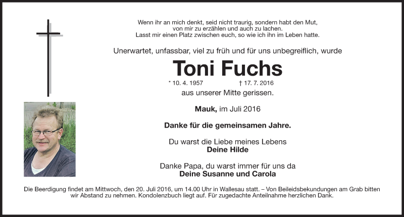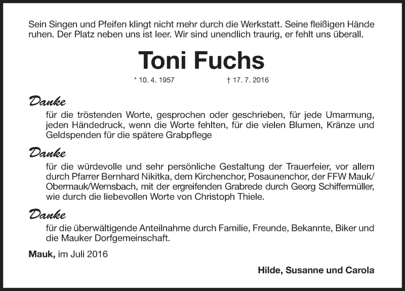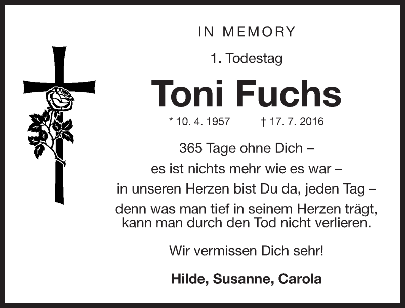 Hier finden Sie alle Traueranzeigen aus der Zeitung, die bisher für Toni Fuchs erschienen sind. Weitere Traueranzeigen, die in der Zeitung erscheinen, werden hier ebenfalls aufgelistet