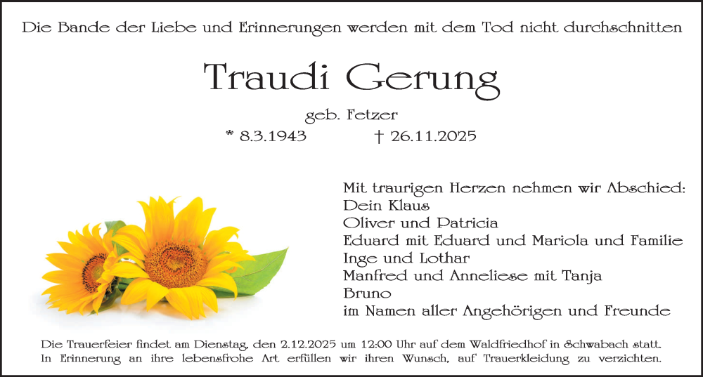 Hier finden Sie alle Traueranzeigen aus der Zeitung, die bisher für Traudi Gerung erschienen sind. Weitere Traueranzeigen, die in der Zeitung erscheinen, werden hier ebenfalls aufgelistet