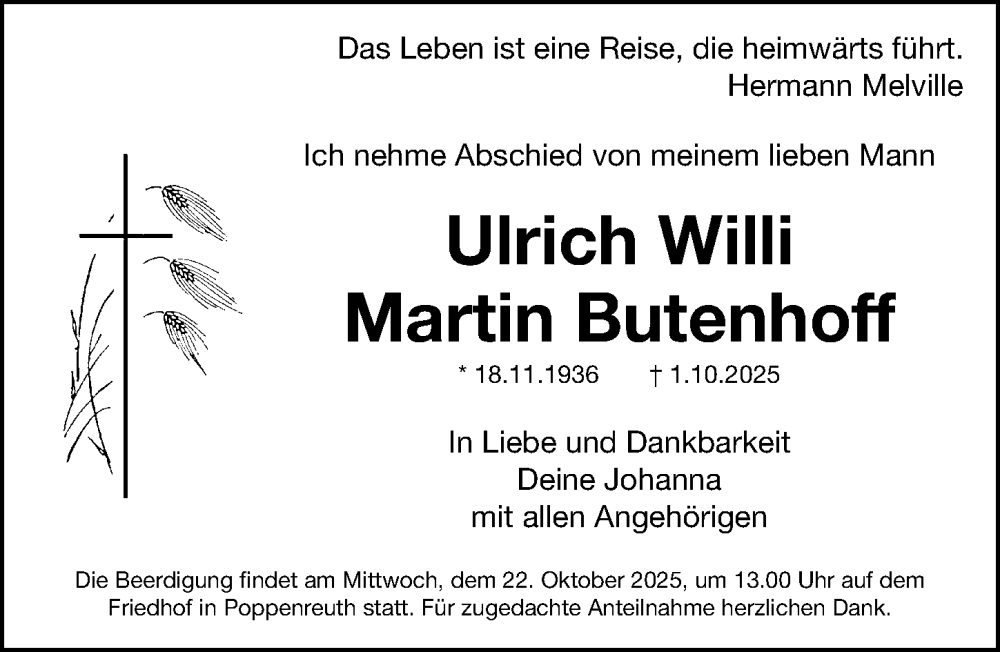 Hier finden Sie alle Traueranzeigen aus der Zeitung, die bisher für Ulrich Willi Martin Butenhoff erschienen sind. Weitere Traueranzeigen, die in der Zeitung erscheinen, werden hier ebenfalls aufgelistet