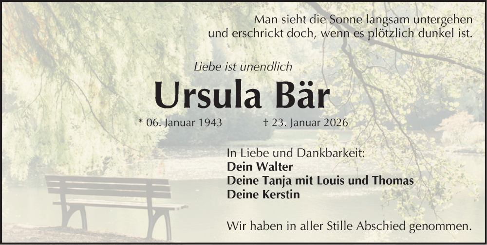 Hier finden Sie alle Traueranzeigen aus der Zeitung, die bisher für Ursula Bär erschienen sind. Weitere Traueranzeigen, die in der Zeitung erscheinen, werden hier ebenfalls aufgelistet