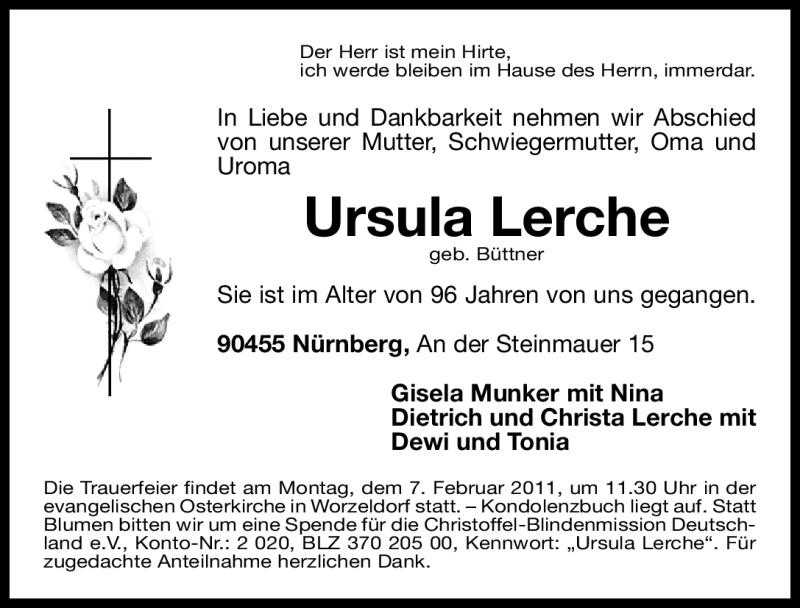 Hier finden Sie alle Traueranzeigen aus der Zeitung, die bisher für Ursula Lerche erschienen sind. Weitere Traueranzeigen, die in der Zeitung erscheinen, werden hier ebenfalls aufgelistet
