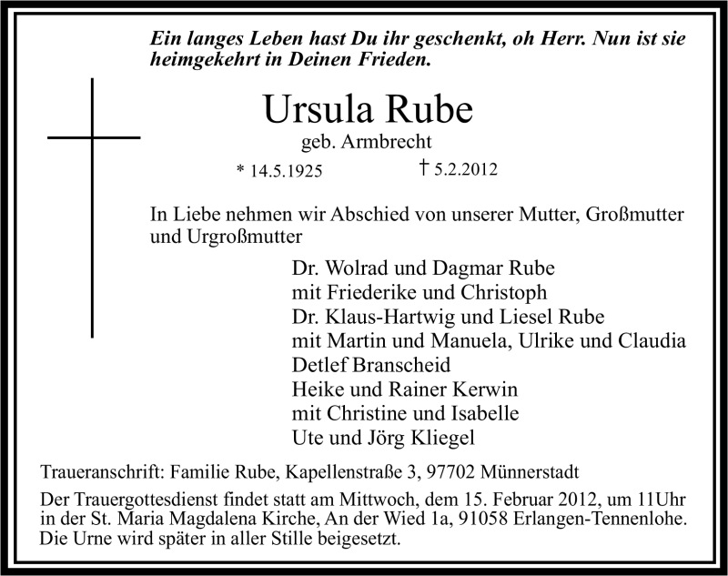 Hier finden Sie alle Traueranzeigen aus der Zeitung, die bisher für Ursula Rube erschienen sind. Weitere Traueranzeigen, die in der Zeitung erscheinen, werden hier ebenfalls aufgelistet